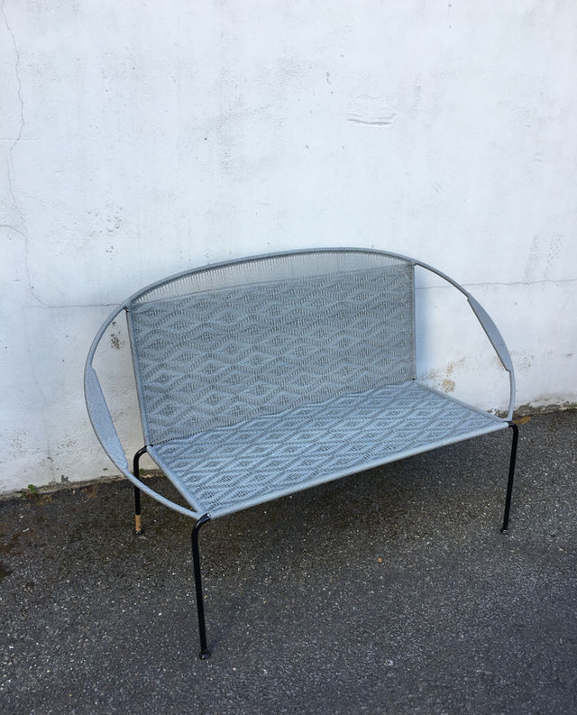 Armature en fer à béton forgée, soudée à la main et traitée anti-rouille. Tressage de fils de pêche teinté en polypropylène.