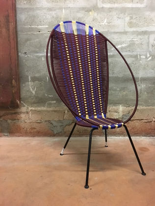 Armature en fer à béton forgée, soudée à la main et traitée anti-rouille. Tressage de fils de pêche teinté en polypropylène.