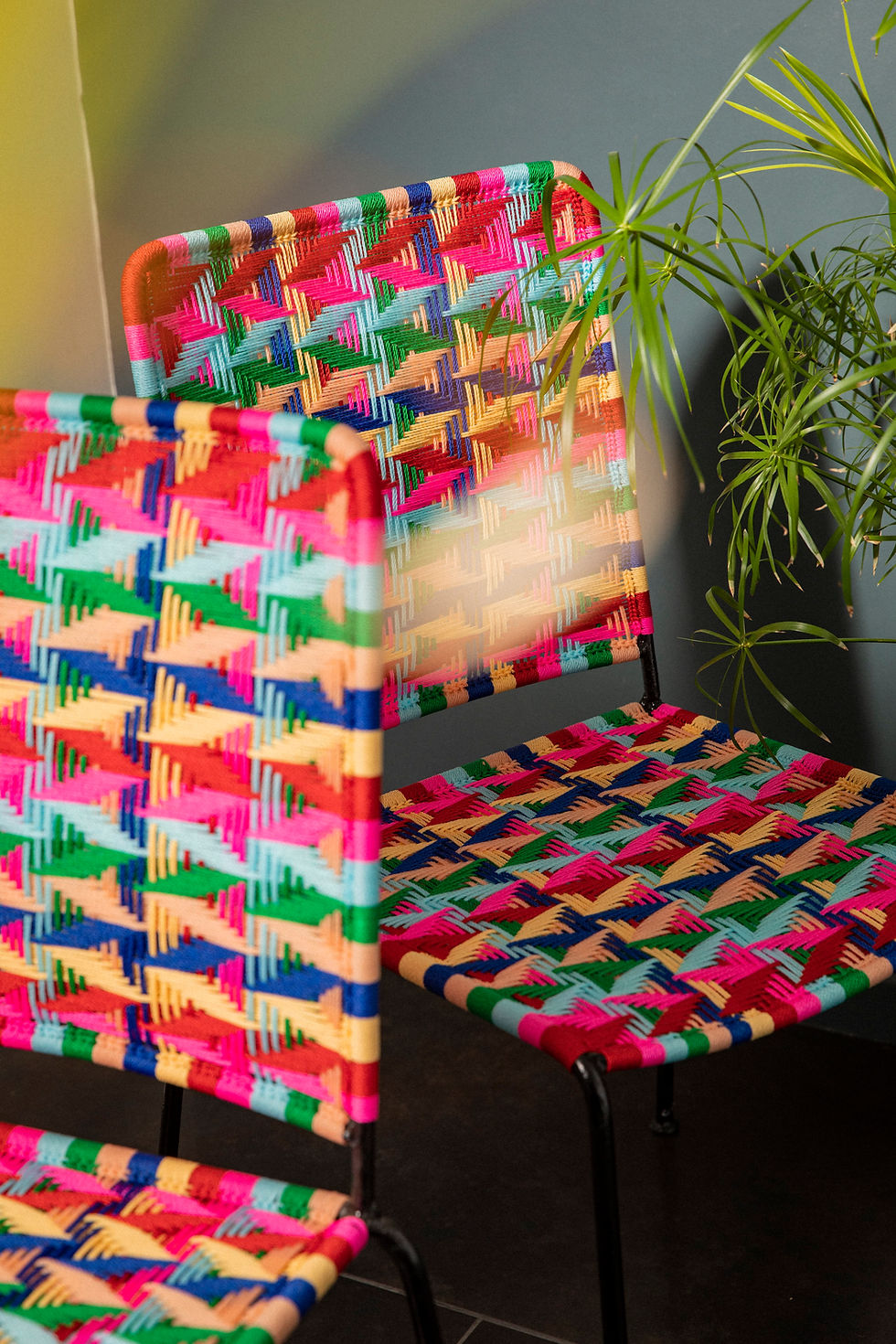 Armature en fer à béton forgée, soudée à la main et traitée anti-rouille. Tressage de fils de pêche teinté en polypropylène.